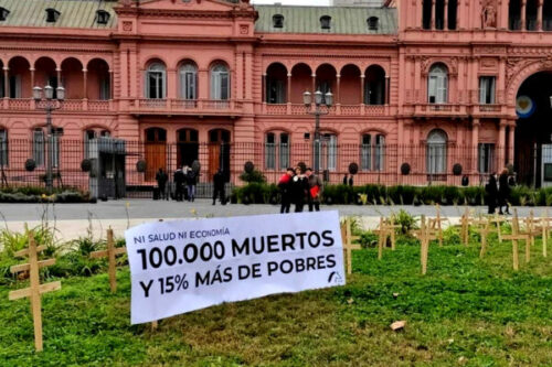 Particular “homenaje” al Gobierno por las victimas de COVID. “Ni salud ni economía. 100.00 muertos y más de 15% de pobres” puede leerse, en referencia los dichos de Alberto.