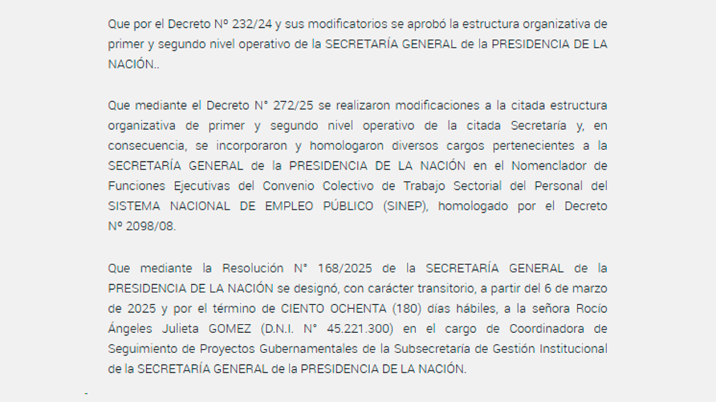 El ascenso de Rocío Ángeles Julieta Gómez, de 22 años, representa la contradicción más cruda del discurso oficial. En abril de 2024 trascendió un video de ella, frente a estudiantes de la UBA, exclamando: “Creemos en la educación pública también como motor del ascenso social, en una sociedad meritocrática, de esfuerzo y de trabajo“. No obstante, su realidad administrativa cuenta una historia diferente: tras desempeñarse como fiscal de La Libertad Avanza en las elecciones de 2023, fue premiada en abril de 2025 con un cargo en la Secretaría General de la Presidencia. Sin experiencia previa, sin haber pasado por un concurso de oposición y sin cumplir con los requisitos mínimos de formación que exige el Estado, su contrato acaba de ser prorrogado, lo que desató una nueva ola de indignación en redes sociales ante la evidencia de una militancia financiada por el contribuyente.