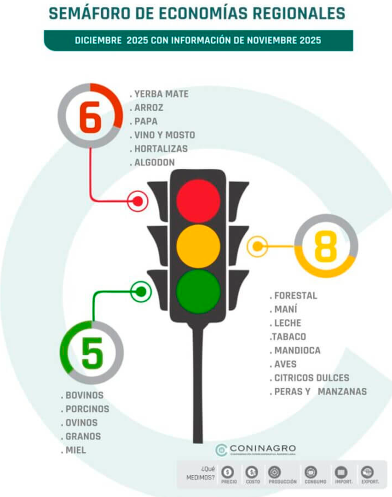 En el corte de noviembre, las actividades ubicadas en rojo fueron yerba mate, arroz, papa, vino y mosto, hortalizas y algodón. En amarillo quedaron forestal, maní, leche, tabaco, cítricos dulces, mandioca, peras y manzanas, y avícola. En verde se ubicaron bovinos, porcinos, ovinos, granos y miel.