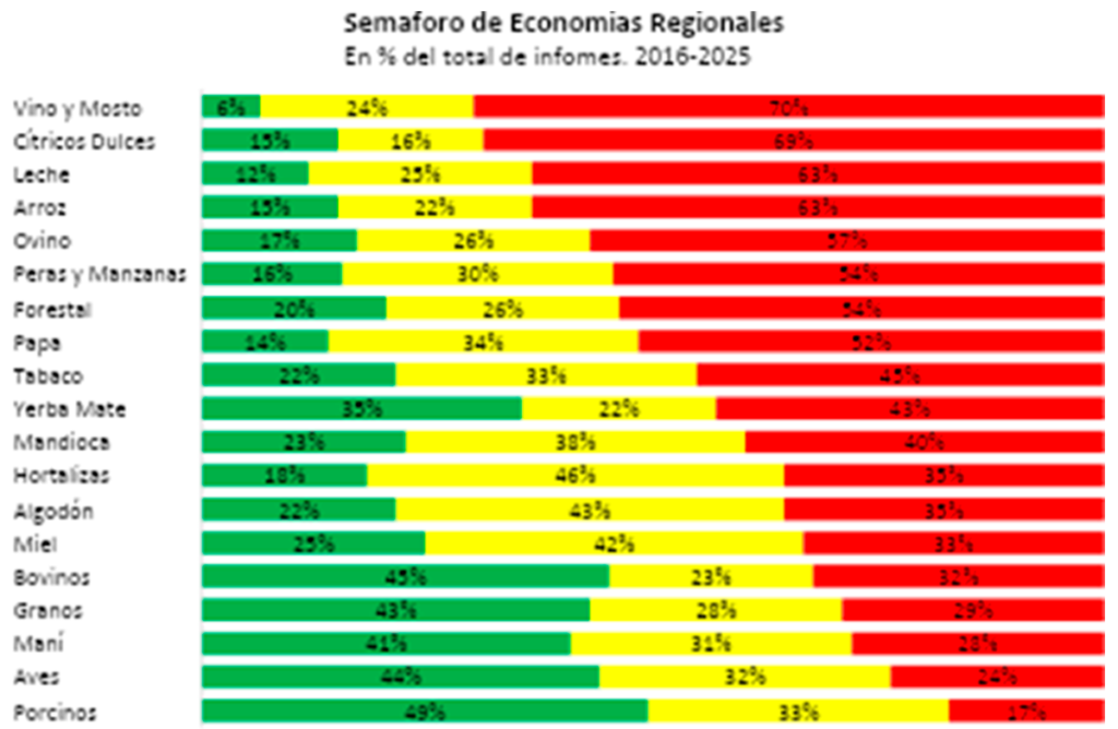 Más allá de la evolución mensual, Coninagro incluyó un análisis retrospectivo del período 2016–2025. Según la entidad agropecuaria, en más de diez años de publicaciones del semáforo, ocho de las 19 economías analizadas pasaron más de la mitad del tiempo en rojo. Entre las más comprometidas ubicó a la vitivinicultura y a los cítricos dulces, que permanecieron en rojo cerca del 70% de los meses. Detrás se ubicaron la lechería y el arroz, con 63%, y luego la producción ovina, junto con peras y manzanas y papa, que rondaron el 55% del período en esa situación.