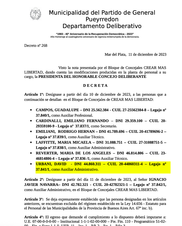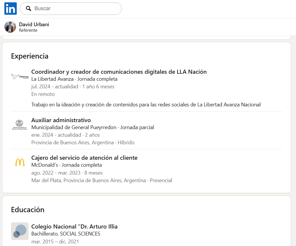 Hoy, con una nula preparación técnica y sólo el bachillerato completo, Urbani acumula funciones como Auxiliar administrativo en el Concejo Deliberante de General Pueyrredón y como Coordinador de comunicación para LLA Nacional. Es el triunfo del “militante todoterreno” que, tras un breve paso por el sector privado, encontró en el Estado un refugio de doble ingreso.