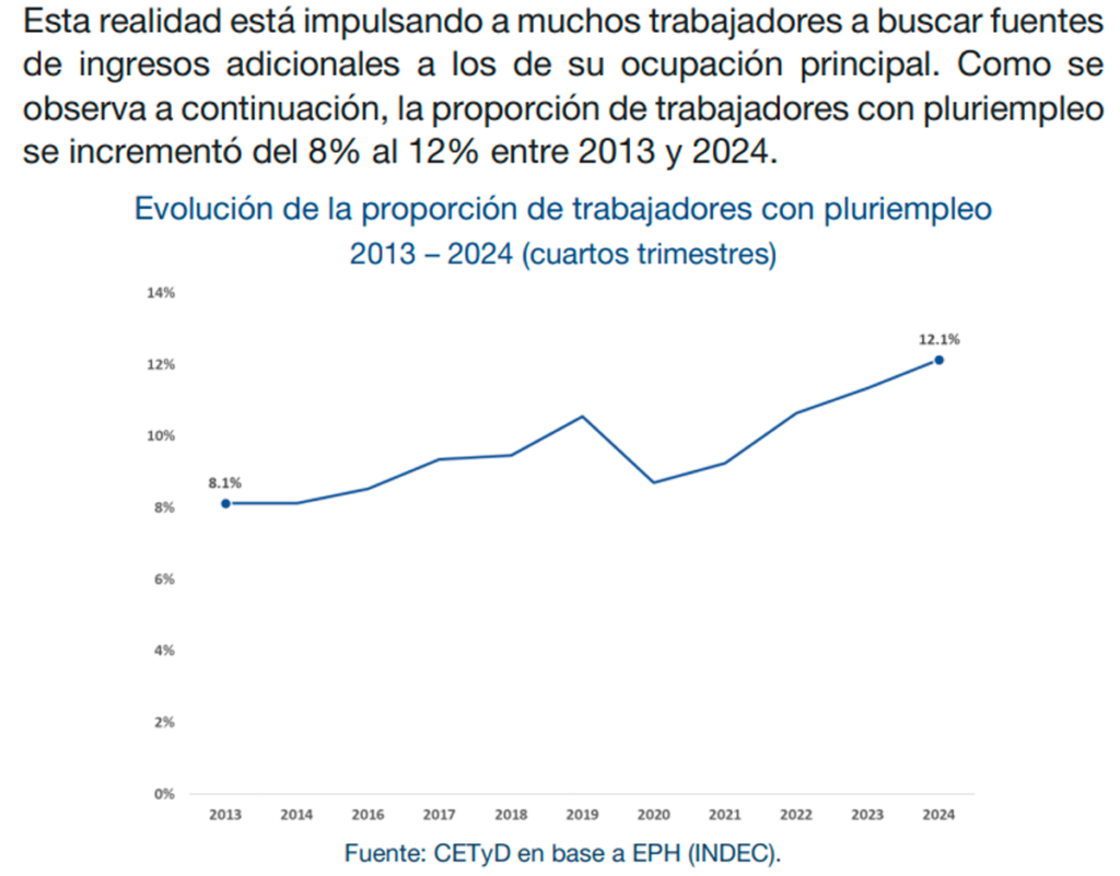 Según el CETyD de la UNSAM, el pluriempleo pasó del 8% en 2013 al 12% en 2024. Una investigación conjunta de ocho universidades nacionales encontró que el 75% de los trabajadores de plataformas los usa como segundo empleo y que la mayoría lo hace “por necesidad”, no por elección. Los ingresos laborales en general se encuentran casi 25% por debajo de los niveles de 2017.