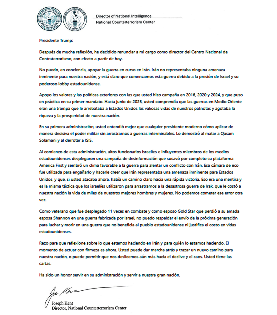 – “No puedo, en conciencia, apoyar la guerra que se libra en Irán”. La renuncia de Kent, publicada en su cuenta de X