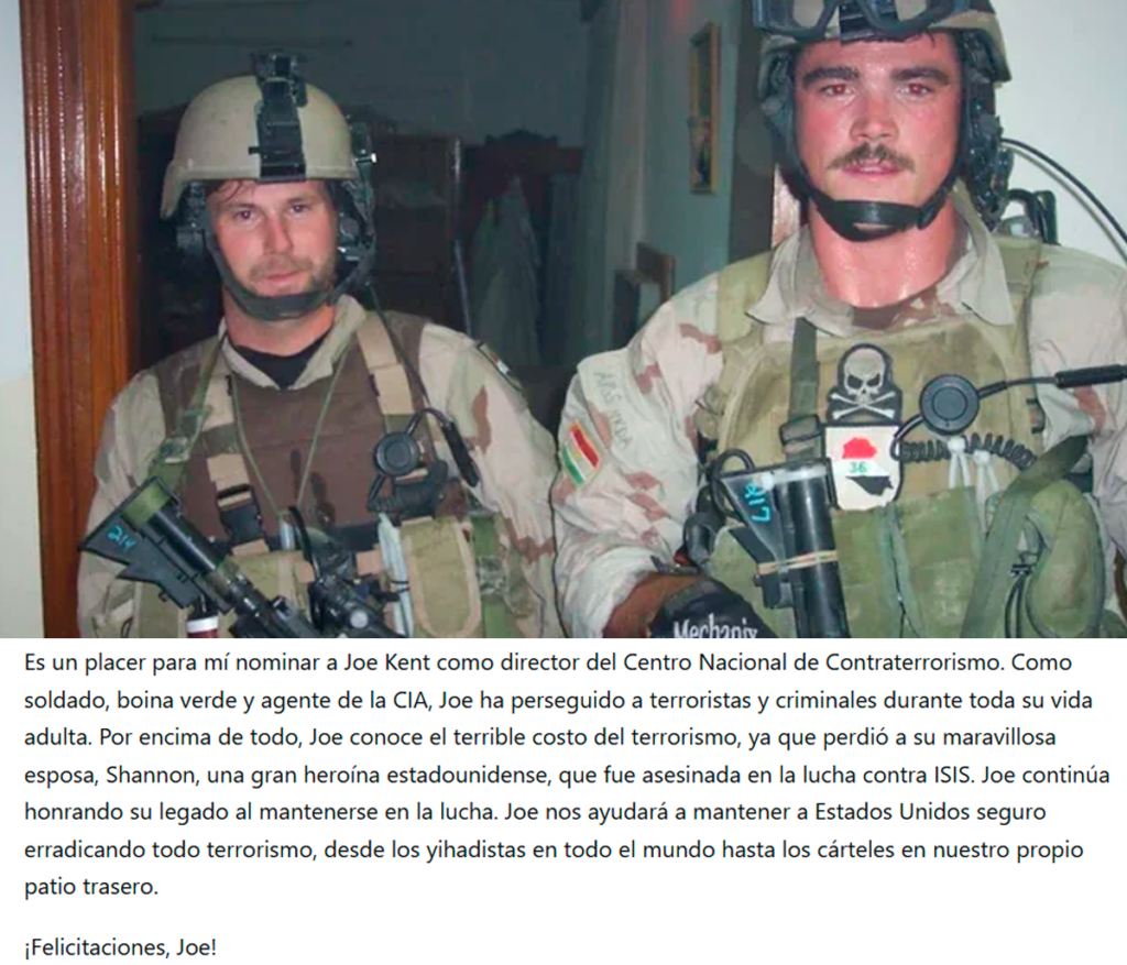 Lejos de ser un hombre de escritorio, Kent es una figura de peso dentro de la política estadounidense. Su trayectoria incluye 20 años en las Fuerzas Especiales del Ejército, 11 despliegues de combate como Boina Verde y trabajo posterior en la CIA.