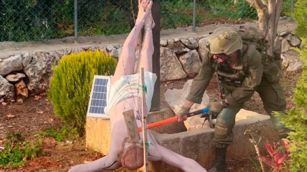 Una fotografía que se viralizó muestra a un soldado israelí armado con un hacha o mazo destruyendo el rostro una escultura de Jesucristo crucificado en la aldea cristiana de Debel, en el sur del Líbano.