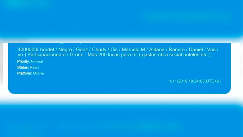 Un año después, los mensajes se refirieron de manera explícita a un porcentaje de sobornos vinculado a los pagos. “El Negro me dijo q si le damos el 40 saca el pago cn el ajuste. Reparte cn Bordet Julio y el. Me pidio el 50 le dije q era alevoso no x el pedido q era incobrable (sic)”, consignó Claudio Tortul en otro chat. En noviembre de 2019, y siempre según las conversaciones incorporadas al expediente, se detalló incluso el reparto de una suma millonaria. “Te paso maso en 5 numeros como quedaria los 10 palos y pico de ENERSA. Los politicos el fronting nosotros. 4000000( bordet / Negro / Gonz / Charly / Cis / Marcelo M / Aldana / Ramiro / Daniel / Vos / yo ) Participacioned en Grone . Mas 200 lucas para mi ( gastos obra social hoteles etc )”, escribió.