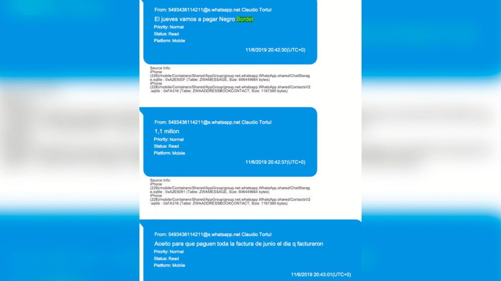 En 2019, esa relación apareció ya asociada a pagos concretos. En los chats, uno de los hermanos afirmó:“esa guita se la lleve yo a Bordet” y agregó: “El jueves vamos a pagar Negro Bordet. 1,1 millon. Aceito para que paguen toda la factura de junio el dia q facturaron”. Esos intercambios formaron parte de las pericias judiciales que describieron las operaciones ilícitas entre 2016 y 2024.