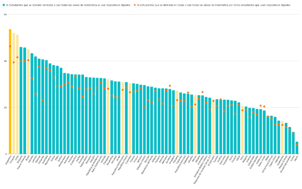 Los números no dejan margen para la duda. Uruguay (52%) y Chile (51%) son los únicos que se aproximan al nivel argentino. Del otro lado del mundo y de la tabla, Japón apenas alcanzó el 5% de alumnos que declararon distraerse.