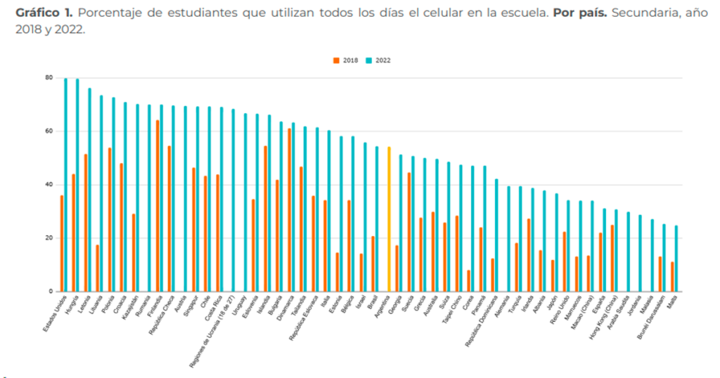 Entre 2018 y 2022, el uso cotidiano del celular dentro de los establecimientos escolares creció en todos los países del mundo sin excepción. Nuestro país no escapó a esa tendencia: el 54% de los alumnos declaró utilizar el dispositivo todos los días en la escuela, un porcentaje que coincide exactamente con el de quienes admitieron distraerse. En cuanto a la tenencia, el 91% de los estudiantes de 15 años contó en 2022 con celular propio con acceso a internet.