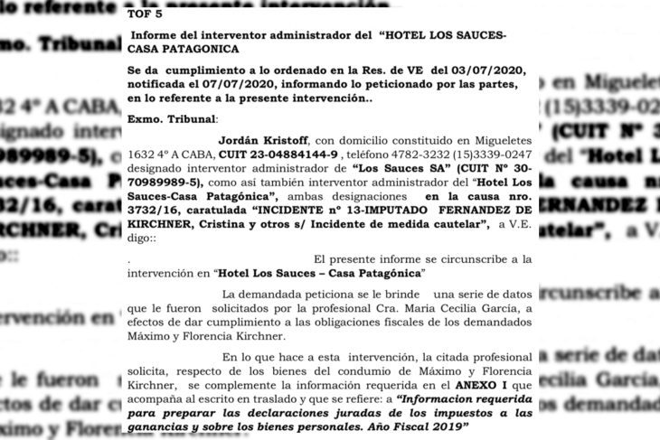 OPI accedió a los informes de los administradores de los bienes de los Kirchner como el elaborado por Jordán Kristoff, designado interventor administrador de “Los Sauces SA” (CUIT No 30- 70989989-5) y el interventor administrador del “Hotel Los Sauces-Casa Patagónica”, ambas designaciones en la causa nro. 3732/16, caratulada “INCIDENTE no 13-IMPUTADO FERNANDEZ DE KIRCHNER, Cristina y otros s/ Incidente de medida cautelar”.