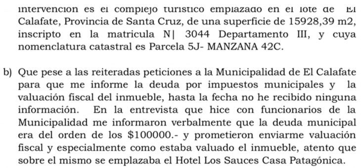 El informe revela “pese a las reiteradas peticiones a la Municipalidad de El Calafate para que me informe la deuda por impuestos municipales y la valuación fiscal del inmueble, hasta la fecha no he recibido ninguna información” destaca el adminsitrador y aclara “En la entrevista que hice con funcionarios de la Municipalidad me informaron verbalmente que la deuda municipal era del orden de los $100.000,00 y prometieron enviarme valuación fiscal y especialmente como estaba valuado el inmueble, atento que sobre el mismo se emplazaba el Hotel Los Sauces Casa Patagónica”.
