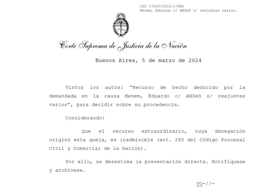 La Corte Suprema dejó firme en marzo de 2024 la sentencia favorable a Eduardo Menem, luego de que la ANSES no lograra revertir el fallo. El expediente también habilitó un retroactivo de $1.500 millones por el reajuste previsional del exsenador.