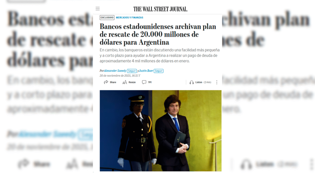 Grandes bancos estadounidenses, según The Wall Street Journal, suspendieron un paquete de financiamiento para la Argentina y evaluaron en su lugar una operación de recompra. El ministro de Economía afirmó que “nunca” habló con las entidades sobre un rescate y atribuyó las versiones a “una operación más”.