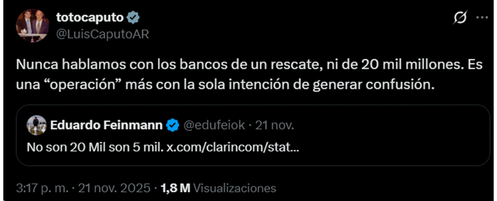 Frente a estas versiones, el ministro de Economía, Luis Caputo, rechazó que el Gobierno hubiera negociado un rescate financiero por US$ 20.000 millones adicionales al swap: “Nunca hablamos con los bancos de un rescate, ni de 20 mil millones. Es una ‘operación’ más con la sola intención de generar confusión”, afirmó en X, respondiendo, de ese modo respondió a las informaciones de The Wall Street Journal.